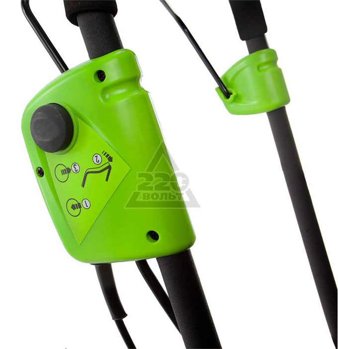 - Чтобы включить культиватор, нужно нажать на кнопку на рукоятке, а затем на рычаг. Это защитит вас от непреднамеренного запуска. Чтобы остановить культиватор, просто отпустите рукоятку.