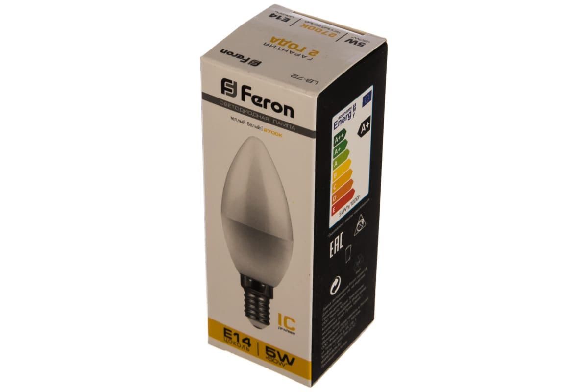 Лампа светодиодная FERON LB-72, C37 (свеча), 5W 230V E14 2700К (белый теплый), рассеиватель матовый белый, 410Lm, угол рассеивания 200°, 100*37мм